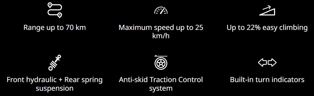 Dual braking system with front drum brake and E-ABS rear brake to offer rear-wheel drive and provide safety.