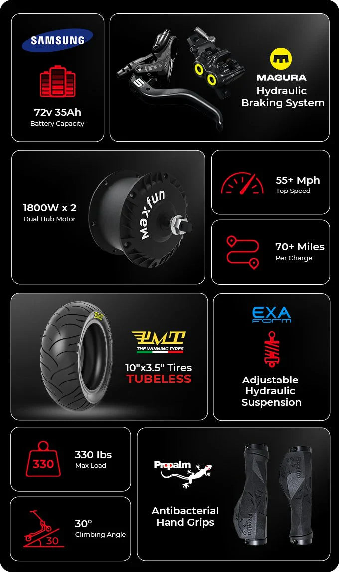The Maxfun 10 MAX is built for serious riders, dual motors, high-capacity battery, top-tier brakes and suspension delivering raw speed, long range, and a smooth ride whether youâre commuting or ripping around off-road
